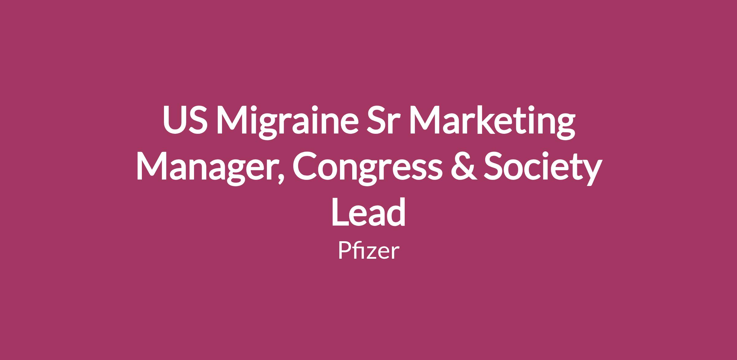 The US Migraine Senior Marketing Manager, Congress & Society Lead will report directly to the Sr Director US Migraine Marketing Lead and partner with Global Marketing, US Migraine Marketing, Migraine Medical as well as with a multitude of agency stakeholders to evolve and execute Pfizer’s Migraine congress strategy and execution plan. Efforts will be specific to launching new campaigns, as well as new/refreshed data, and the potential for labeling changes.
